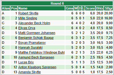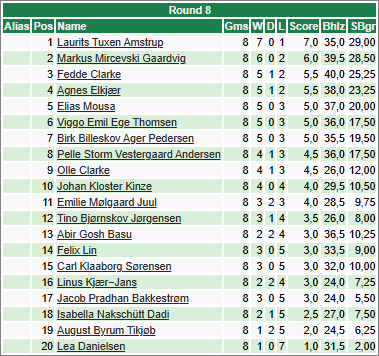 De fire øverste grupper (A, B, C og D) var slået sammen, så Matti – som spiller i den laveste D gruppe – fik hård modstand. Han opnåede dog en flot samlet 5. plads ud af 13 spillere, og i D gruppen fik han en andenplads.